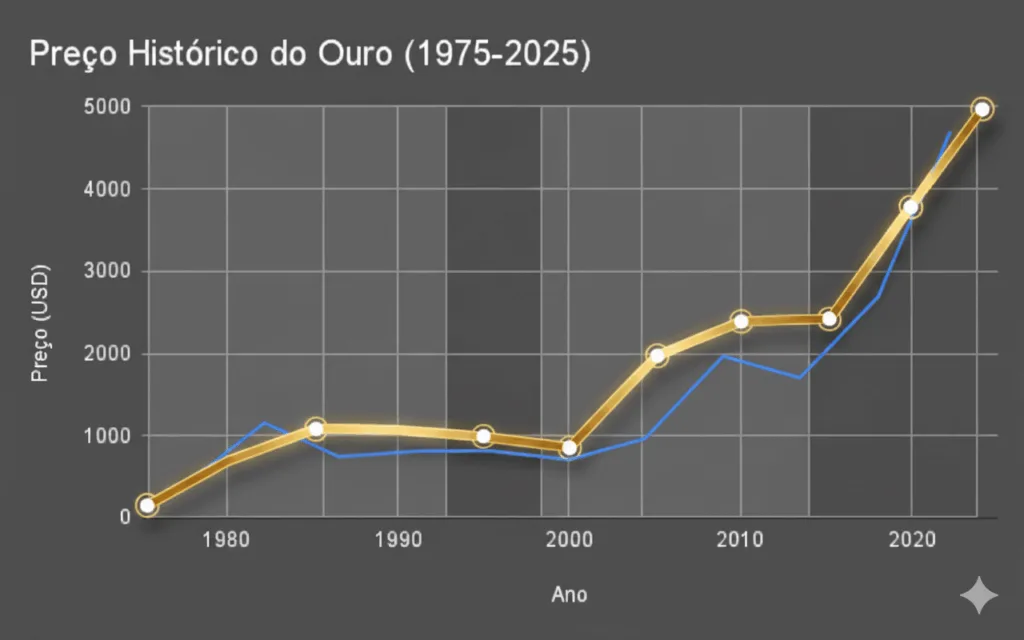 Como podemos ver, o preço do ouro em dólar passou por períodos de alta e de baixa, mas sua trajetória de longo prazo é claramente ascendente. Os picos no gráfico não são aleatórios: eles frequentemente coincidem com grandes crises globais, como a crise do petróleo no final dos anos 70, a crise financeira de 2008 e a pandemia de 2020. Em cada um desses momentos, enquanto a incerteza dominava, investidores correram para a segurança do ouro, elevando seu preço. É a tese da “reserva de valor” em ação.