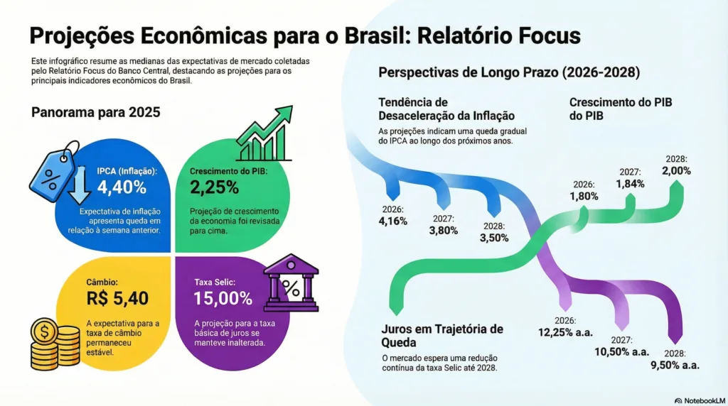 2. O Custo Monetário: “Juros Altos por Mais Tempo” A contrapartida para essa resiliência econômica é a manutenção do rigor monetário. A taxa Selic não apenas deve permanecer estacionada em um patamar contracionista de 15,00% até o final de 2025, como as expectativas de cortes para 2026 foram frustradas, com a projeção subindo para 12,25%. Isso indica que o Banco Central terá pouco espaço para afrouxar a política monetária no médio prazo.